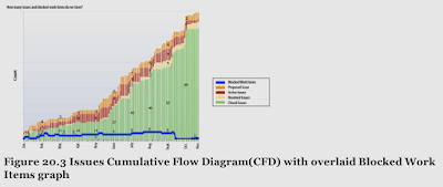 Even though pink tickets on the card wall provide a strong visualization of how many items are currently blocked, it is also useful to track and report issues in other ways. A cumulative-flow diagram of issues and blocked work items provides a strong visual indicator of the organizational capability at issue management and resolution.